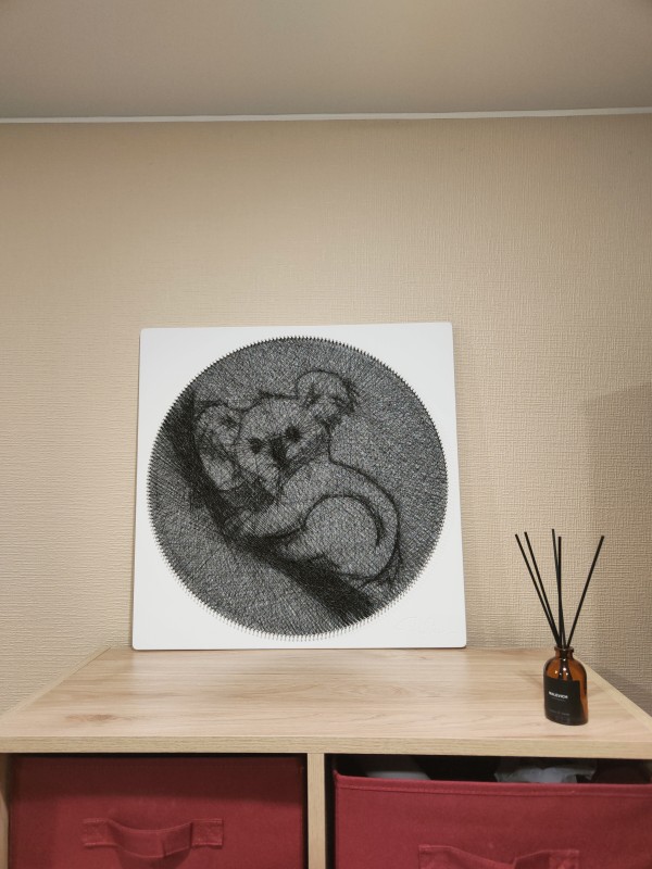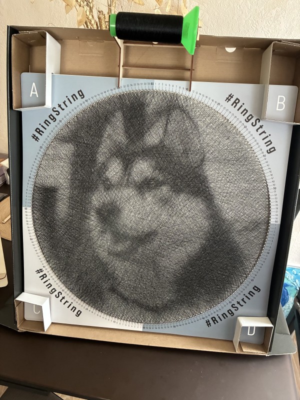 Замечательный набор получила в подарок от подруги, но, наверное, около года не могла решиться сесть за воплощение его в картину. Прошел год, как со мной нет моей любимой собаки, и только сейчас смогла сесть и сделать. Просто не передать словами, насколько мне нравится эта картина, это что-то невероятное. Из нитей и гвоздей создать такую красоту. Спасибо создателям за такую фантастическую идею. Смотрится очень стильно, а самое главное греет душу!